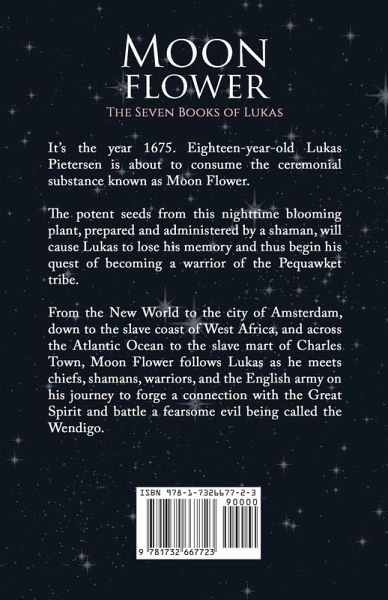It's the year 1675. Eighteen-year-old Lukas Pietersen is about to consume the ceremonial substance known as Moon Flower. The potent seeds from this nighttime blooming plant, prepared and administered by a shaman, will cause Lukas to lose his memory and thus begin his quest of becoming a warrior of the Pequawket tribe. From the New World to the city of Amsterdam, down to the slave coast of West Africa, and across the Atlantic Ocean to the slave mart of Charles Town, Moon Flower follows Lukas as he meets chiefs, shamans, warriors, and the English army on his journey to forge a connection with the Great Spirit and battle a fearsome evil being called the Wendigo.