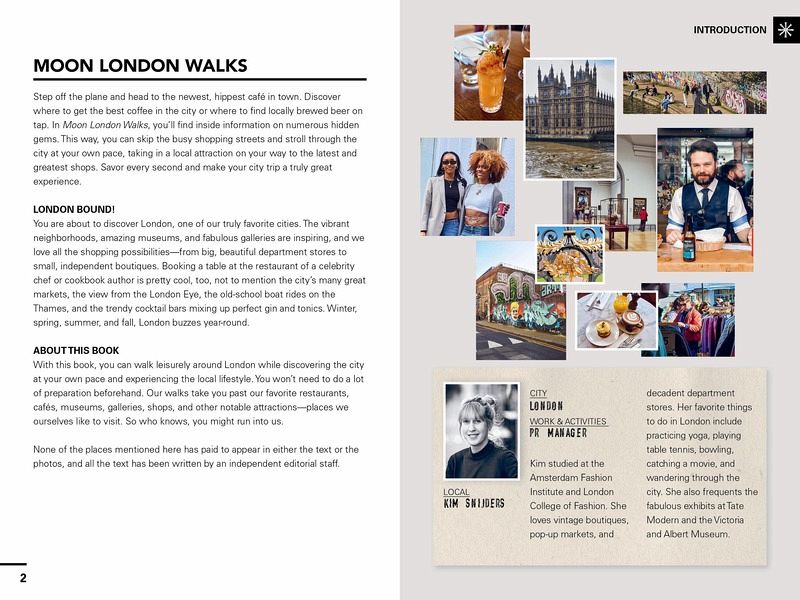 Whether you're shopping on the high street, strolling lively street markets, or admiring renowned modern art, experience London like a local: on foot! * Walk through the city's coolest neighborhoods like Shoreditch, Chelsea, Marylebone, and more, with color-coded stops and turn-by-turn directions * Find your scene with top ten lists of the best restaurants, nightlife, markets, and more * Get to know the real London on six customizable walks: Find funky vintage treasures in Shoreditch or treat yourself at an upscale department store like Harrods. Make your way to the Tate Modern and other world-famous art galleries, take in London's history at Westminster Abbey, and watch the changing of the guard at Buckingham Palace. Take a leisurely stroll through Regent's Park, enjoy afternoon tea at a stylish hotel, or grab a pint and some fish and chips before heading to the theatre. Sip craft cocktails in an old train station, discover the hippest new gastropub, or watch the sun set over the city from a chic rooftop bar * Escape the crowds at locally-loved spots and under-the-radar favorites * Explore on the go with foldout maps of each walking route and a removable full-city map, all in a handy guide that fits in your pocket With creative routes, public transit options, and a full-city map, you can experience London at your own pace without missing a beat. Hit the ground running with more Walks guides, like Moon New York City Walks, Moon Paris Walks, Moon Tokyo Walks, and Moon Rome Walks. About Moon Travel Guides: Moon was founded in 1973 to empower independent, active, and conscious travel. We prioritize local businesses, outdoor recreation, and traveling strategically and sustainably. Moon Travel Guides are written by local, expert authors with great stories to tell—and they can't wait to share their favorite places with you. For more inspiration, follow @moonguides on social media.