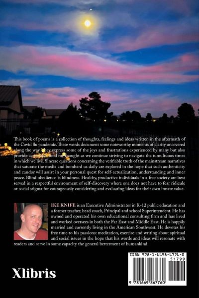 This book of poems is a collection of thoughts, feelings and ideas written in the aftermath of the Covid flu pandemic. These words document some noteworthy moments of clarity uncovered along the way. They express some of the joys and frustrations experienced by many but also provide actionable food for thought as we continue striving to navigate the tumultuous times in which we live. Sincere questions concerning the verifiable truth of the mainstream narratives that saturate the media and bombard us daily are explored in the hope that such authenticity and candor will assist in your personal quest for self-actualization, understanding and inner peace. Blind obedience is blindness. Healthy, productive individuals in a free society are best served in a respectful environment of self-discovery where one does not have to fear ridicule or social stigma for courageously considering and evaluating ideas for their own innate value.