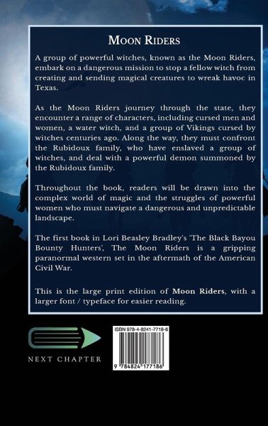 A group of powerful witches, known as the Moon Riders, embark on a dangerous mission to stop a fellow witch from creating and sending magical creatures to wreak havoc in Texas. As the Moon Riders journey through the state, they encounter a range of characters, including cursed men and women, a water witch, and a group of Vikings cursed by witches centuries ago. Along the way, they must confront the Rubidoux family, who have enslaved a group of witches, and deal with a powerful demon summoned by the Rubidoux family. Throughout the book, readers will be drawn into the complex world of magic and the struggles of powerful women who must navigate a dangerous and unpredictable landscape. The first book in Lori Beasley Bradley's 'The Black Bayou Bounty Hunters', The Moon Riders is a gripping paranormal western set in the aftermath of the American Civil War. This is the large print edition of Moon Riders, with a larger font / typeface for easier reading.