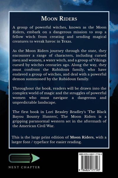 A group of powerful witches, known as the Moon Riders, embark on a dangerous mission to stop a fellow witch from creating and sending magical creatures to wreak havoc in Texas. As the Moon Riders journey through the state, they encounter a range of characters, including cursed men and women, a water witch, and a group of Vikings cursed by witches centuries ago. Along the way, they must confront the Rubidoux family, who have enslaved a group of witches, and deal with a powerful demon summoned by the Rubidoux family. Throughout the book, readers will be drawn into the complex world of magic and the struggles of powerful women who must navigate a dangerous and unpredictable landscape. The first book in Lori Beasley Bradley's 'The Black Bayou Bounty Hunters', The Moon Riders is a gripping paranormal western set in the aftermath of the American Civil War. This is the large print edition of Moon Riders, with a larger font / typeface for easier reading.