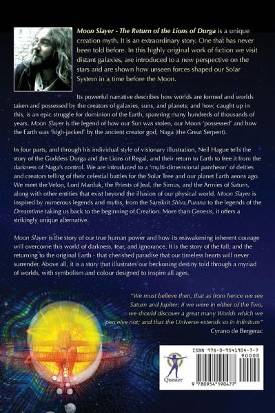 Moon Slayer - The Return of the Lions of Durga is a unique creation myth. It is an extraordinary story. One that has never been told before. In this highly original work of fiction we visit distant galaxies, are introduced to a new perspective on the stars and are shown how unseen forces shaped our Solar System in a time before the Moon. Its powerful narrative describes how worlds are formed and worlds taken and possessed by the creators of galaxies, suns, and planets; and how, caught up in this, is an epic struggle for dominion of the Earth, spanning many hundreds of thousands of years. Moon Slayer is the legend of how our Sun was stolen, our Moon 'possessed' and how the Earth was 'high-jacked' by the ancient creator god, Naga (the Great Serpent). In four parts, and through his individual style of visionary illustration, Neil Hague tells the story of the Goddess Durga and the Lions of Regal, and their return to Earth to free it from the darkness of Naga's control. We are introduced to a 'multi-dimensional pantheon' of deities and creators telling of their celestial battles for the Solar Tree and our planet Earth aeons ago. We meet the Velon, Lord Marduk, the Priests of Jeal, the Simus, and the Armies of Saturn, along with other entities that exist beyond the illusion of our physical world. Moon Slayer is inspired by numerous legends and myths, from the Sanskrit Shiva Purana to the legends of the Dreamtime taking us back to the beginning of the Creation. More than Genesis, it offers a strikingly unique alternative. Moon Slayer is the story of our true human power and how its reawakening inherent courage will overcome this world of darkness, fear, and ignorance. It is the story of the fall; and the returning to the original Earth - that cherished paradise that our timeless hearts will never surrender. Above all, it is a story that illustrates our beckoning destiny told through a myriad of worlds, with symbolism and colour designed to inspire all ages.