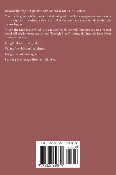 Discover the magic of kindness with Moon the Kind Little Witch! Can you imagine a witch who, instead of doing mischief, helps everyone in need? Moon is a very special little witch, with a heart full of kindness and a magic wand that she only uses to do good. "Moon the Kind Little Witch" is a children's book that will transport you to a magical world full of adventures and lessons. Through Moon's stories, children will learn about the importance of: Being kind and helping others. Valuing friendship and solidarity. Using your skills to do good. Believing in the magic that is in each of us. Why is this book perfect for you? Ideal for all ages: The little ones will have fun with Luna's illustrations and adventures, while the older ones will appreciate the teachings and values that the book conveys. The perfect gift for Halloween: Surprise your children, nephews, or grandchildren with a magical and educational story that they will love. Encourages reading and imagination: Luna's stories will spark children's curiosity and encourage them to explore new worlds. Positive values: The book conveys values such as kindness, friendship, and solidarity, which are essential for children's development. Don't miss the opportunity to give a little magic and kindness! A perfect gift for Halloween and any occasion!