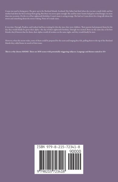 Ceana was used to being poor. She grew up in the Shetland Islands, Scotland. Her father had died when she was just a small child, and her mother had done her best to keep them going. But there was never quite enough. She and her sister Saorise had gone to bed hungry on more than one occasion. On the eve of her eighteenth birthday, Ceana's mam is acting strange. She had sat Ceana down for a long talk about the moon and something about the moon waking. None of it made sense. It was time. Darragh, Peadrus, and Luthais had been waiting for this day since they were children. Their parents had prepared them for the day they would finally be given their alpha-the day of their eighteenth birthday. Darragh was excited. Born on the same day as his best friends, they'd known that for them, their alphas would all awaken on the same night, and they would finally be men. However, when the moon wakes, none of them could be prepared for the scent and longing they felt, pulling them to the tip of the Shetland Islands they called home in search of their mate. This is a why choose MMMF. There are MM scenes with potentially triggering subjects. Language and themes suited to 18+
