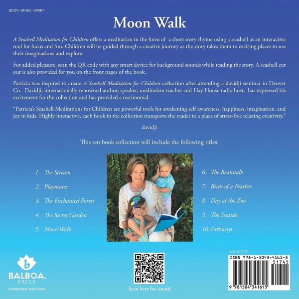 Moon Walk, A Seashell Meditation for Children offers a meditation in the form of a short story rhyme using a seashell as an interactive tool for focus and fun. Children will be guided through a creative journey as the story takes them to exciting places to use their imaginations and explore. For added pleasure, scan the QR code with any smart device for background sounds while reading the story. A seashell cut out is also provided for you on the front pages of the book. Patricia was inspired to create A Seashell Meditation for Children collection after attending a davidji seminar in Denver Co. Davidji, internationally renowned author, speaker, meditation teacher and Hay House radio host, has expressed his excitement for the collection and has provided a testimonial. "Patricia's Seashell Meditations for Children are powerful tools for awakening self awareness, happiness, imagination, and joy in kids. Highly interactive, each book in the collection transports the reader to a place of stress-free relaxing creativity." davidji This ten book collection will include the following titles: The Stream Playmates The Enchanted Forest The Secret Garden Moon Walk The Beanstalk Birds of a Feather Day at the Zoo The Seaside Pathways