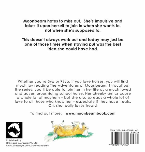 Moonbeam hates to miss out. She's impulsive and takes it upon herself to join in when she wants to, not when she's supposed to. This doesn't always work out and today may just be one of those times when staying put was the best idea she could have had. Whether you're 3yo or 93yo, if you love horses, you will find much joy reading The Adventures of Moonbeam. Throughout the series, you'll be able to join her in her life as a much loved and adventurous riding school horse. Her cheeky antics cause a whole lot of mayhem - but she also spreads a whole lot of love to all those who know her - especially if they have treats. Oh, she really loves treats!