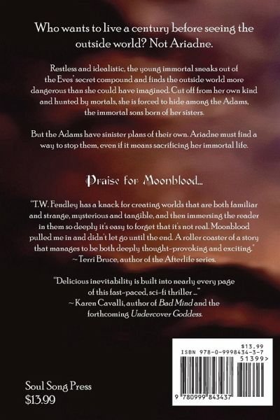 Who wants to live a century before seeing the outside world? Not Ariadne. Restless and idealistic, the young immortal sneaks out of the Eves' secret compound and finds the outside world more dangerous than she could have imagined. Cut off from her own kind and hunted by mortals, she is forced to hide among the Adams, the immortal sons born of her sisters. But the Adams have sinister plans of their own. Ariadne must find a way to stop them, even if it means sacrificing her immortal life.