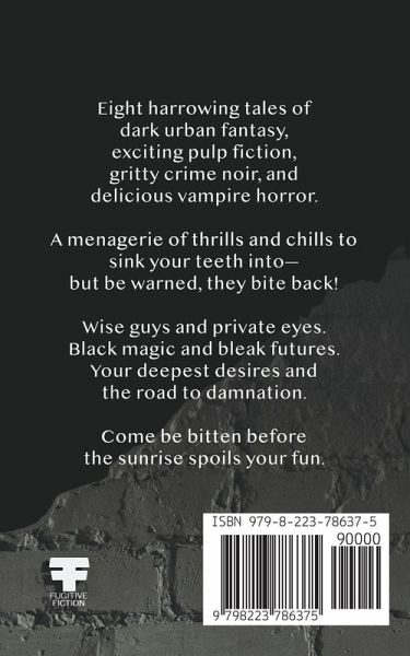 Eight harrowing tales of dark urban fantasy, exciting pulp fiction, gritty crime noir, and delicious vampire horror. A menagerie of thrills and chills to sink your teeth into-but be warned, they bite back!Lawrence is a private detective with supernatural instincts and a nose for trouble. And when the moon is full, he's at his best. But when his sexy new client reveals her darkest secret, will Lawrence prove to be the wolf or the lamb? An expedition in 1920's Egypt threatens to crush young love when archeologists James and Pauline uncover the lost tomb of an ancient priestess best left buried. There is no greater high than the bite of a vampire. And no greater addiction. Jaded paramedic Zeus Contreras fights to save those who would throw away their lives for a cheap thrill and a shot at immortality. Picking up strangers proves lustful and dangerous for Paul, a young man who thought he had nothing to lose but his loneliness. Private detective Harry Celeste tracks a case rife with sex bots, killing machines, and old wounds that refuse to heal. Can he solve it without getting his hard-boiled heart broken? Or worse, torn clean out of his chest? Wise guys and private eyes. Black magic and bleak futures. Your deepest desires and the road to damnation. Come be bitten before the sunrise spoils your fun.