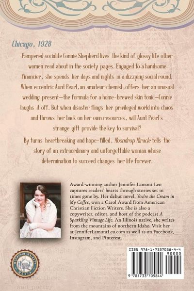 Chicago, 1928. Pampered socialite Connie Shepherd lives the kind of glossy life other women read about in the society pages. Engaged to a handsome financier, she spends her days and nights in a dizzying social round. When eccentric Aunt Pearl, an amateur chemist, offers her an unusual wedding present--the formula for a home-brewed skin tonic--Connie laughs it off. But when disaster flings her privileged world into chaos and throws her back on her own resources, will Aunt Pearl's strange gift provide the key to survival? By turns heartbreaking and hope-filled, Moondrop Miracle tells the story of an extraordinary and unforgettable woman whose determinatio to succeed changes her life forever.