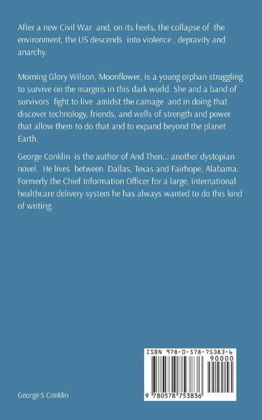 After a new Civil War and, on its heels, the collapse of the environment, the US descends into violence , depravity and anarchy. Morning Glory Wilson, Moonflower, is a young orphan struggling to survive on the margins in this dark world. She and a band of survivors fight to live amidst the carnage and in doing that discover technology, friends, and wells of strength and power that allow them to do that and to expand beyond the planet Earth.