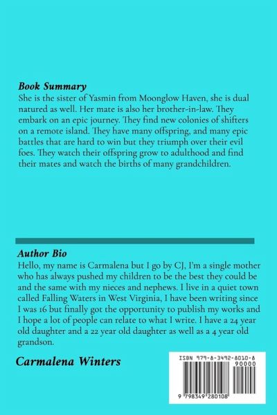 She is the sister of Yasmin from Moonglow Haven, she is dual natured as well. Her mate is also her brother-in-law. They embark on an epic journey. They find new colonies of shifters on a remote island. They have many offspring, and many epic battles that are hard to win but they triumph over their evil foes. They watch their offspring grow to adulthood and find their mates and watch the births of many grandchildren. They become the leaders' of a huge tribe of shifters who have been hidden from the world on a remote island off the coast of Bora Bora. A enemy surfaces wanting to destroy their whole family and their descendants, and everyone else they know and love. The packs of Moonglow Haven, Moonglow Retreat, Crescent River, and the tribes of Bora Bora join together to create an unstoppable army to defend their way of life. After they defeat this new enemy, they think everything is going to be better for them. WRONG. Another threat surfaces, find out what happens by reading this incredible story.