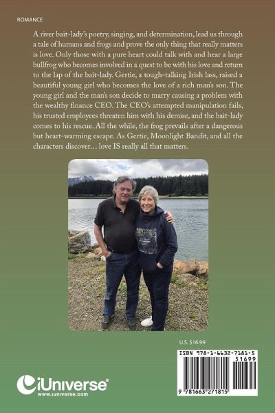 A river bait-lady's poetry, singing, and determination, lead us through a tale of humans and frogs and prove the only thing that really matters is love. Only those with a pure heart could talk with and hear a large bullfrog who becomes involved in a quest to be with his love and return to the lap of the bait-lady. Gertie, a tough-talking Irish lass, raised a beautiful young girl who becomes the love of a rich man's son. The young girl and the man's son decide to marry causing a problem with the wealthy finance CEO. The CEO's attempted manipulation fails, his trusted employees threaten him with his demise, and the bait-lady comes to his rescue. All the while, the frog prevails after a dangerous but heart-warming escape. As Gertie, Moonlight Bandit, and all the characters discover... love IS really all that matters.