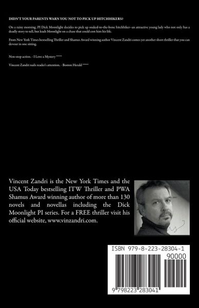 DIDN'T YOUR PARENTS WARN YOU NOT TO PICK UP HITCHHIKERS? On a rainy morning, PI Dick Moonlight decides to pick up soaked-to-the-bone hitchhiker--an attractive young lady who not only has a deadly story to tell, but leads Moonlight on a chase that could cost him his life. From New York Times bestselling Thriller and Shamus Award winning author Vincent Zandri comes yet another short thriller that you can devour in one sitting. For fans of Robert B. Parker, Michael Connelly, JR Rain, Joe Lansdale and more. Grab this pulse-pounding thriller now. Non-stop action. - I Love a Mystery ***** Vincent Zandri nails reader's attention. - Boston Herald ***** (Zandri) demonstrates an uncanny knack for exposition, introducing new characters and narrative possibilities with the confidence of an old pro...Zandri does a superb job interlocking puzzle pieces. - The San Diego Union-Tribune *****