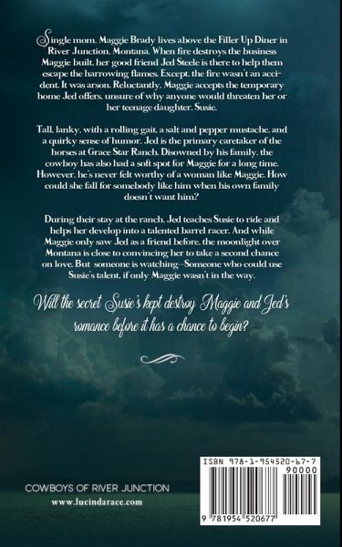 Enjoy this clean, small town western romance by award winning and bestselling author, Lucinda Race. Single mom, Maggie Brady lives above the Filler Up Diner in River Junction, Montana. When fire destroys the business Maggie built, her good friend Jed Steel is there to help them escape from the harrowing flames. Except, the fire wasn't an accident. It was arson. Reluctantly, Maggie accepts the temporary home Jed offers, unsure why anyone would threaten her or her teenage daughter, Susie. Tall, lanky, with a rolling gait, a salt and pepper mustache, and a quirky sense of humor, Jed is the primary caretaker of the horses at Grace Star Ranch. Disowned by his family, the cowboy has also had a soft spot for Maggie for a long time. However, he's never felt worthy of a woman like Maggie. How could she fall for somebody like him when his own family doesn't want him? During their stay at the ranch, Jed teaches Susie to ride and helps her to develop into a talented barrel racer. And while Maggie has only seen Jed as a friend before, the moonlight over Montana is close to convincing her to take a second chance on love. But someone is watching Susie - someone who could use Susie's talent if only Maggie wasn't in the way. Will the secret that Susie's keeping destroy Maggie and Jed's romance before it has a chance to begin? Moonlight Over Montana is the third novel in the Cowboys of River Junction Series, although each book can be read as standalone. A sweet and clean romantic story with a guaranteed happily ever after. Happy reading!