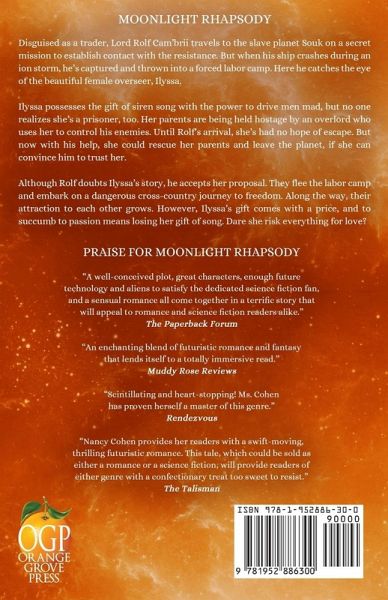 A diplomat captured as a spy and a sultry songstress flee their enemies on an outlawed planet in this action-packed science fiction romance. Disguised as a trader, Lord Rolf Cam'brii travels to the slave planet Souk on a secret mission to establish contact with the resistance. But when his ship crashes during an ion storm, he's captured and thrown into a forced labor camp. Here he catches the eye of the beautiful female overseer, Ilyssa. Ilyssa possesses the gift of siren song with the power to drive men mad, but no one realizes she's a prisoner, too. Her parents are being held hostage by an overlord who uses her to control his enemies. Until Rolf's arrival, she's had no hope of escape. But now with his help, she could rescue her parents and leave the planet, if she can convince him to trust her. Although Rolf doubts Ilyssa's story, he accepts her proposal. They flee the labor camp and embark on a dangerous cross-country journey to freedom. Along the way, their attraction to each other grows. However, Ilyssa's gift comes with a price, and to succumb to passion means losing her gift of song. Dare she risk everything for love?