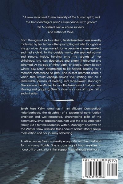 From the ages of six to sixteen, Sarah Rose Kairn was sexually molested by her father, often prompting suicidal thoughts as she got older. As a grown adult, she became a nurse, married, and had a child. To the outside world, she seemed normal and secure. Inside, holding onto the secrets of her childhood, she was depressed and angry, frightened and ashamed. At the age of thirty-eight, on a cold, gray, Boston winter day, Sarah determined to kill herself, pausing for a moment beforehand to pray. And in that moment came a vision that would change Sarah's life, starting her on a remarkable journey of healing and rediscovery. Moonlight Shadows on the Winter Snow is the true story of that journey. Moving and gripping, Sarah's story is a story of hope, faith, and miracles.