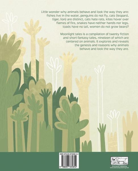 Little wonder why animals behave and look the way they are: fishes live in the water, penguins do not fly, cats (leopard, tiger, lion) are distinct, cats hate rats, kites hover over flames of fire, snakes have neither hands nor legs, toads have no tail, women do not grow beard? Moonlight tales is a compilation of twenty fiction and short fantasy tales, nineteen of which are centred on animals. It explores and reveals the genesis and reasons why animals behave and look the way they are. Each tale ends with a simple crossword and questions that could help improve a child’s intellect and moral standards. The tales are accompanied by 40 full-page illustrations created by talented artist Tereza Dostálová. It is a children picture book manuscript.