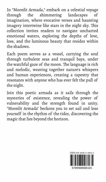 In "Moonlit Armada," embark on a celestial voyage through the shimmering landscapes of imagination, where evocative verses and haunting imagery intertwine like stars in the night sky. This collection invites readers to navigate uncharted emotional waters, exploring the depths of love, loss, and the luminous beauty that resides within the shadows. Each poem serves as a vessel, carrying the soul through turbulent seas and tranquil bays, under the watchful gaze of the moon. The language is rich and melodic, weaving together nature's whispers and human experiences, creating a tapestry that resonates with anyone who has ever felt the pull of the night. Join this poetic armada as it sails through the mysteries of existence, revealing the power of vulnerability and the strength found in unity. "Moonlit Armada" beckons you to set sail and lose yourself in the rhythm of the tides, discovering the magic that lies beyond the horizon.