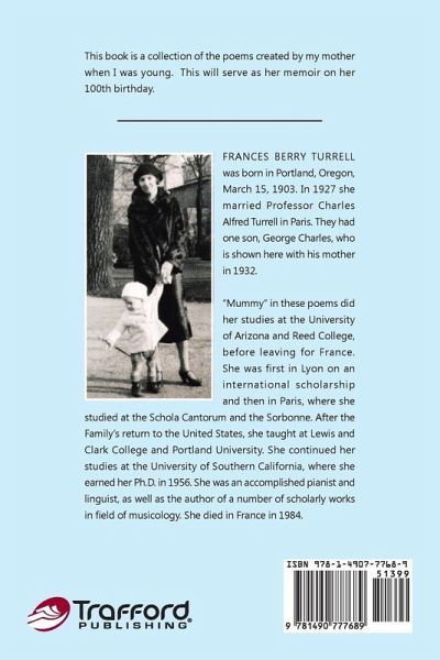 Frances Berry Turrell was born in Portland, Oregon, March 15, 1903. In 1927 she married Professor Charles Alfred Turrell in Paris. They had one son, George Charles, who is shown here with his mother in 1932. "Mummy" in these poems did her studies at the University of Arizona and Reed College, before leaving for France. She was first in Lyon on an international scholarship and then in Paris, where she studied at the Schola Cantorum and the Sorbonne. After the Family's return to the United States, she taught at Lewis and Clark College and Portland University. She continued her studies at the University of Southern California, where she earned her Ph.D. in 1956. She was an accomplished pianist and linguist, as well as the author of a number of scholarly works in field of musicology. She died in France in 1984.
