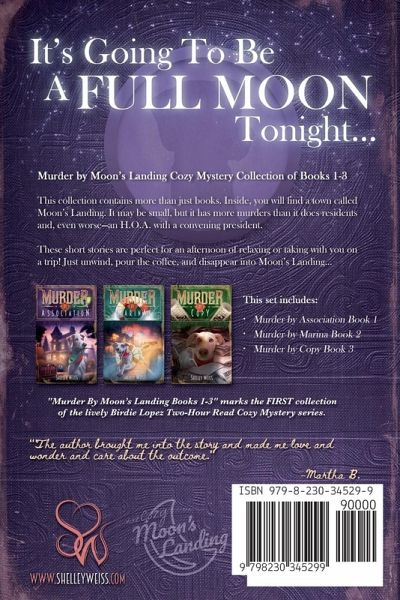 It's Going to be a Full Moon Tonight... Murder by Moon's Landing Cozy Mystery Collection of Books 1-3 This collection contains more than just books. Inside, you will find a town called Moon's Landing. It may be small, but it has more murders than it does residents and, even worse--an H.O.A. with a convening president. These short stories are perfect for an afternoon of relaxing or taking with you on a trip! Just unwind, pour the coffee, and disappear into Moon's Landing... This set includes: Murder by Association Book 1 Murder by Marina Book 2 Murder by Copy Book 3 Murder by Moon's Landing Books 1-3 marks the FIRST collection of the lively Birdie Lopez Two-Hour Read Cozy Mystery series.