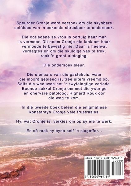 Speurder Cronje word versoek om die skynbare selfdood van 'n bekende sitrusboer te ondersoek. Die oorledene se vrou is oortuig haar manis vermoor. Dit neem Cronje nie lank om haar vermoede te bevestig nie. Daar is heelwat verdagtes,en om die skuldige vas te trek, raak 'n groot uitdaging. Die ondersoek sleur. Die eienaars van die gastehuis, waar die moord gepleeg is, tree uiters vreemd op. Selfs die weduwee het 'n twyfelagtige verlede. Boonop sukkel Cronje om met die ywerige en onervare patoloog, Righard Roux oor die weg te kom. In dié tweede boek beleef die enigmatiese Konstantyn Cronje vele frustrasies. Hy, wat Cronje is, verkies om op sy eie te werk. En só raak hy byna self 'n slagoffer...