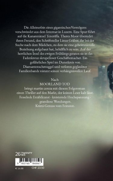 Die Alleinerbin eines gigantischenVermögens verschwindet aus dem Internat in Luzern. Eine Spur führt auf die Kanareninsel Teneriffa. Theres Moor überredet ihren Freund, den Schriftsteller Linus Gräber, ihr bei der Suche nach dem Mädchen, zu dem sie eine geheimnisvolle Beziehung aufgebaut hat, behilflich zu sein. Auf der herrlichen Insel des ewigen Frühlings geraten sie in das Fadenkreuz skrupelloser Geschäftemacher. Ein gefährliches Spiel im Dunstkreis von Diamantenschmuggel und verloren geglaubter Familienbande nimmt seinen verhängnisvollen Lauf.Nach "Moorland Tod" bringt martin cereza mit diesem Folgeroman einen Thriller auf den Markt, der keinen Leser kalt lässt.Fesselnde Erzählkunst - knisternde Hochspannung - grandiose Wendungen.Krimi-Genuss vom Feinsten.