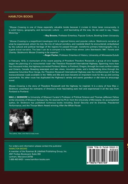 In February 1919, in memoriam of the recent passing of President Theodore Roosevelt, a group of civic leaders began the planning of a monumental road-the Theodore Roosevelt International Highway. Spanning more than 4,000 miles, the highway connected Portland, Maine to Portland, Oregon through the most northern states and Ontario Canada. Boasting seascapes and lake views, mountain vistas, and a breathtaking drive through the awesome Columbia River Gorge, the Theodore Roosevelt International Highway was the northernmost of the few transcontinental roads available in the 1920s and 30s and soon became an important route for the up and coming automobile. No other route has duplicated the Highway's variety and scenic grandeur or did more to encourage travel. Moose Crossing is the story of Theodore Roosevelt and the highway he inspired. It is a story of how Max Skidmore unearthed the remnants of America's most fascinating auto trail and experienced it all the way from Portland to Portland.