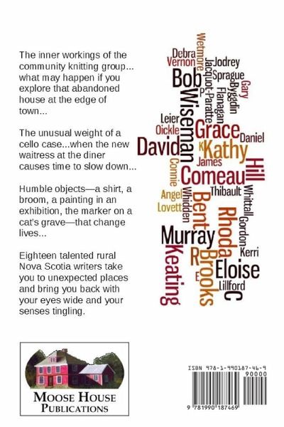 Eighteen talented rural Nova Scotia writers take you to unexpected places and bring you back with your eyes wide and your senses tingling. The inner workings of the community knitting group...what may happen if you explore that abandoned house on the edge of town...the unusual weight of a cello case...when the new waitress at the diner causes time to slow down...humble objects--a shirt, a broom, a painting at an exhibition, the marker on a cat's grave--that change lives...