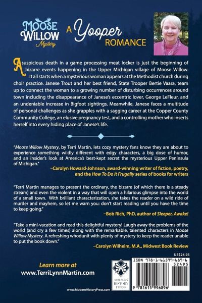 A suspicious death in a game processing meat locker is just the beginning of bizarre events happening in the Upper Michigan village of Moose Willow. It all starts when a mysterious woman appears at the Methodist church during choir practice. Janese Trout and her best friend, State Trooper Bertie Vaara, team up to connect the woman to a growing number of disturbing occurrences around town including the disappearance of Janese's eccentric lover, George LeFleur, and an undeniable increase in Bigfoot sightings. Meanwhile, Janese faces a multitude of personal challenges as she grapples with a sagging career at the Copper County Community College, an elusive pregnancy test, and a controlling mother who inserts herself into every hiding place of Janese's life. "'Moose Willow Mystery, by Terri Martin, lets cozy mystery fans know they are about to experience something wildly different with edgy characters, a big dose of humor, and an insider's look at America's best-kept secret the mysterious Upper Peninsula of Michigan." -- Carolyn Howard-Johnson, award-winning writer of fiction, poetry, and the HowToDoItFrugally Series of books for writers "Martin describes life in a small town by using humor, and moody, compassionate and restless characters. Characters searching for the answers to life while trying to maintain a semblance of normalcy. Strange occurrences lead the sleuths down a path of discovery. Janese, forced to face her fears, manages to find true happiness. If you are looking for a book that is hard to put down, Moose Willow Mystery is that kind of book. It's entertaining, a fun read and definitely a page-turner." -- Sharon Brunner, U.P. Book Review "Terri Martin manages to present the ordinary, the bizarre (of which there is a steady stream), and even the violent in a way that will open a hilarious glimpse into the world of a small town. With brilliant characterization, she takes the reader on a wild ride of murder and mayhem, so let me warn you. Don't start reading until you have the time to keep going. -- Bob Rich, PhD, author of Sleeper, Awake!" Take a mini-vacation and read this delightful mystery! Laugh away the problems of the world (and cry a few times) along with the remarkable, talented characters in Moose Willow Mystery. A refreshing whodunit with plenty of mystery to keep the reader unable to put the book down." -- Carolyn Wilhelm, M.A., Midwest Book Review "A plug for the book on the back cover calling it a 'cozy mystery' almost turned me off before I opened it. The book made me laugh and chuckle much too often to make this reader feel snug and comfortable. What makes this novel work is Janese's sense of the ridiculous, and her wonderful sense of humor. I also found the start and stop of the narrative amusing as she's constantly getting side-tracked by unexpected problems, ideas, and ruminations over anything that might pop into her head. More than once while reading I wanted to shout, 'Focus Janese, focus!' This is a woman wondering if she's with child, buys an at-home pregnancy test that takes minutes to use but can't complete the test because she is so easily distracted. You have of course noted that I've given full credit for the book's success to Janese, a fictional character and not the author. That is the mark of a good writer." -- Tom Powers, Michigan in Books Learn more at www.TerriLynnMartin.com