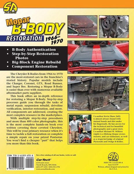 The photos in this edition are black and white. The Chrysler B-Bodies from 1966 to 1970 are the most-restored cars in the franchise's storied history. Popular models among them include the Charger, Coronet, GTX, Road Runner, and Super Bee. Restoring a Mopar B-Body is easier than ever with numerous of available aftermarket parts suppliers. This book offers an in-depth resource for restoring a Mopar B-Body. Step-by-step processes walk you through the tasks of metal repair, suspension rebuild, driveline verification, interior restoration, and more. All components are addressed, creating the most complete resource in the marketplace. With multiple step-by-step procedures and more than 400 color photographs, this is the most-complete hands-on book ever written covering these coveted Chryslers. This will be your primary resource when it's time to tackle a full restoration or complete a simple repair on your prized Pentastar. You won't find a cheaper "part" that helps you more than Mopar B-Body Restoration 1966-1970.