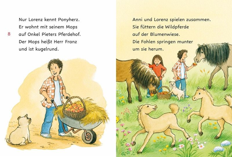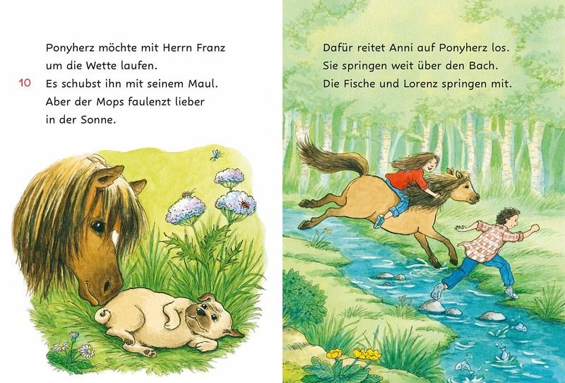 1. Lesestufe: Große Fibelschrift, leichte WörterKleine Texteinheiten und kurze Sätze in Kombination mit vielen bunten BildernBekannte Reihe »Ponyherz« motiviert zum Lesenlernen