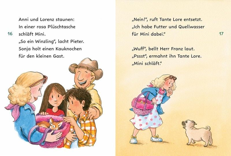 In Band 1 (978-3-551-69083-8) klaut der Mops Herr Franz einen Leckerbissen vom Geburtstagsbuffet und stolpert auf der Suche nach einem Versteck über einige Hindernisse.