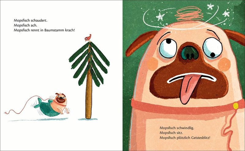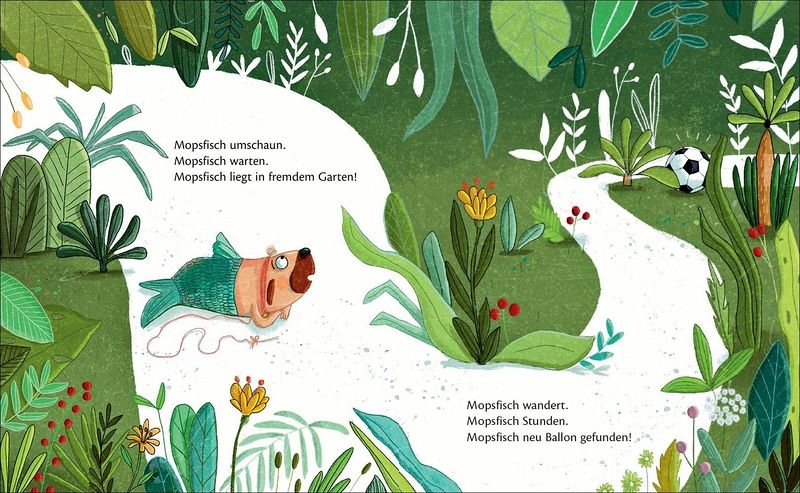 Was ist nur mit dem Mopsfisch los? Grade noch lila, ist er jetzt rot und bald schon ein Luftballonpilot? Ungeduldig und neugierig zieht er gleich weiter: Ob man in diese Efeuwand gelangen kann? Aber ja: »Mopsfisch kletter./Mopsfisch rauf./Mopsfisch nimmt Gefahr in Kauf!« Und als ein zweiter Mopsfisch auftaucht, ist er auch nicht mehr allein: »Mopsfisch Mopsfisch Nummer zwei. / Mopsfisch Mopsfisch Plauderei!«