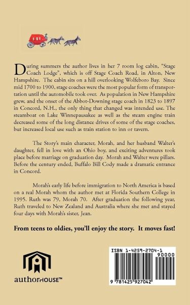 During summers the author lives in her 7 room log cabin, "Stage Coach Lodge", which is off Stage Coach Road, in Alton, New Hampshire. The cabin sits on a hill overlooking Wolfeboro Bay. Since mid 1700 to 1900, stage coaches were the most popular form of transportation until the automobile took over. As population in New Hampshire grew, and the onset of the Abbot-Downing stage coach in 1823 to 1897 in Concord, N.H.,the only thing that changed was intended use.. The steamboat on Lake Winnepausakee as well as the steam engine train decreased some of the long distance drives of some of the stage coaches, but increased local use such as train station to innor tavern. Morah and Walter's daughter fell in love with an Ohio boy, and exciting adventures took place before marriage on graduation day. Morah and Walter were pillars. Before the century ended, Buffalo Bill Cody made a dramatic entrance in Concord. The author met the real Morah at Florida Southern College in 1995. Ruth was 79, Morah 70. After graduation the following year, Ruth traveled to New Zealand and Australia where she met and stayed four days with Morah's sister, Jean. From teens to oldies, you'll enjoy the story. It moves fast!