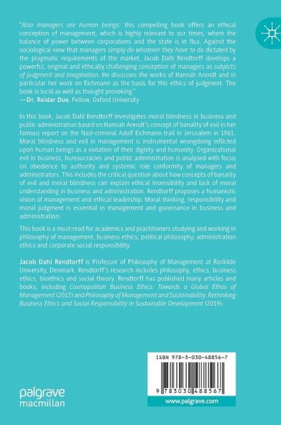In this book, Jacob Dahl Rendtorff investigates moral blindness in business and public administration based on Hannah Arendt's concept of banality of evil in her famous report on the Nazi-criminal Adolf Eichmann trail in Jerusalem in 1961. Moral blindness and evil in management is instrumental wrongdoing inflicted upon human beings as a violation of their dignity and humanity. Organizational evil in business, bureaucracies and public administration is analysed with focus on obedience to authority and systemic role conformity of managers and administrators. This includes the critical question about how concepts of banality of evil and moral blindness can explain ethical insensibility and lack of moral understanding in business and administration. Rendtorff proposes a humanistic vision of management and ethical leadership. Moral thinking, responsibility and moral judgment is essential in management and governance in business and administration.