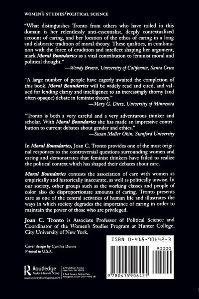 In Moral Boundaries Joan C. Tronto provides one of the most original responses to the controversial questions surrounding women and caring. Tronto demonstrates that feminist thinkers have failed to realise the political context which has shaped their debates about care. It is her belief that care cannot be a useful moral and political concept until its traditional and ideological associations as a women's morality are challenged. Moral Boundaries contests the association of care with women as empirically and historically inaccurate, as well as politically unwise. In our society, members of unprivileged groups such as the working classes and people of color also do disproportionate amounts of caring. Tronto presents care as one of the central activites of human life and illustrates the ways in which society degrades the importance of caring in order to maintain the power of those who are privileged.