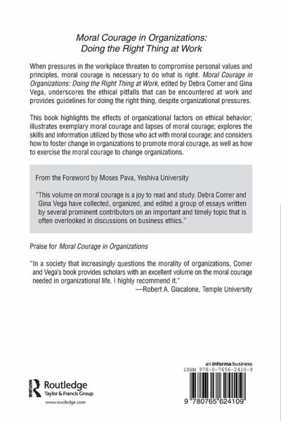 The topic of moral courage is typically missing from business ethics instruction and management training. But moral courage is what we need when workplace pressures threaten to compromise our values and principles. Moral Courage in Organizations: Doing the Right Thing at Work, edited by Debra Comer and Gina Vega, underscores for readers the ethical pitfalls they can expect to encounter at work and enhances their ability do what they know is right, despite these organizational pressures. The book highlights the effects of organizational factors on ethical behavior; illustrates exemplary moral courage and lapses of moral courage; explores the skills and information that support those who act with moral courage; and considers how to change organizations to promote moral courage, as well as how to exercise moral courage to change organizations. By giving readers who want to do the right thing guidelines for going about it, Moral Courage in Organizations: Doing the Right Thing at Work is a potent tool to foster more ethical organizational behavior.