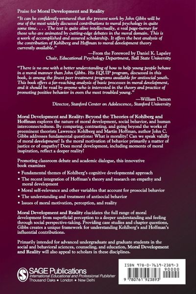 Moral Development and Reality: Beyond the Theories of Kohlberg and Hoffman explores the nature of moral development, social behavior, and human interconnectedness. By comparing, contrasting, and going beyond the works of pre-eminent theorists Lawrence Kohlberg and Martin Hoffman, author John C. Gibbs addresses fundamental questions: What is morality? Can we speak validly of moral development? Is the moral motivation of behavior primarily a matter of justice or of empathy? Does moral development, including moments of moral inspiration, reflect a deeper reality? Moral Development and Reality elucidates the full range of moral development from superficial perception to a deeper understanding and feeling through social perspective-taking. Providing case studies and chapter questions, Gibbs creates a unique framework for understanding Kohlberg's and Hoffman's influential contributions.