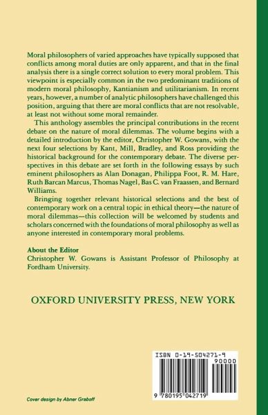 The essays in this volume illuminate a central topic in ethical theory: moral dilemmas. Some contemporary philosophers dispute the traditional view that a true moral dilemma - a situation in which a person has two irreconcilable moral duties - cannot exist. The book provides the historical background to the on-going debate with selections from Kant, Mill, Bradley, and Ross. The best recent work is represented in essays by Donagan, Foot, Hare, Marcus, Nagel, van Fraassen, Williams, and others.