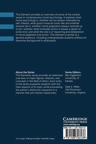 This Element provides an overview of some of the central issues in contemporary moral psychology. It explores what moral psychology is, whether moral judgments always motivate us to act, whether what motivates action is always a desire of some kind, and what the role is of reasoning and deliberation in moral judgment and action.