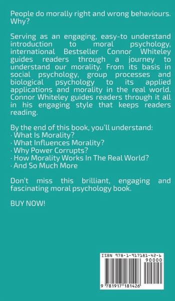 People do morally right and wrong behaviours. Why? Serving as an engaging, easy-to-understand introduction to moral psychology, international Bestseller Connor Whiteley guides readers through a journey to understand our morality. From its basis in social psychology, group processes and biological psychology to its applied applications and morality in the real world. Connor Whiteley guides readers through it all in his engaging style that keeps readers reading. By the end of this book, you'll understand: · What Is Morality? · What Influences Morality? · Why Power Corrupts? · How Morality Works In The Real World? · And So Much More Don't miss this brilliant, engaging and fascinating moral psychology book. BUY NOW!Moral Psychology Content Introduction Part One: Introduction To Morality And Moral Psychology Introduction To Moral Reasoning, Moral Judgements And Moral Foundations Theory Principles And Theories Of Morality Introduction To Being Virtuous And Amoral Part Two: Influences On Morality Are Infants Moral? How Does Categorising Our Relationships Impact Our Moral Judgements? How Does Social Influence Impact Morality? Why People Conform? Controversies Of The Experiments How Did Morality Evolve? Why Is Morality Powerful? Part Three: Grey Areas Of Morality Introduction To Moral Grey Areas What Is The Social Anchoring Of Right And Wrong? What Is The Moral Self And How Does It Connect To Moral Grey Areas? The Interplay Between Thoughts And Experiences Why Moral Judgements Aren't Always Bad? How Power Corrupts? Part Four: Real World Morality 5 Signs Of Psychopathic Personality Why Are We Divided On What Makes A Good Society? How Does Lying Evolve Across The Lifespan? Bystanderism And Altruism Why People Don't Help? Altruism Morality And The Basics Of Cult Psychology How Do Narcissists Use Cult Leader Tactics? How Lying Destroys Self-Esteem? Conclusion: Why We Always Need To Be Moral In Psychology And Why There Are No Excuses In This Book