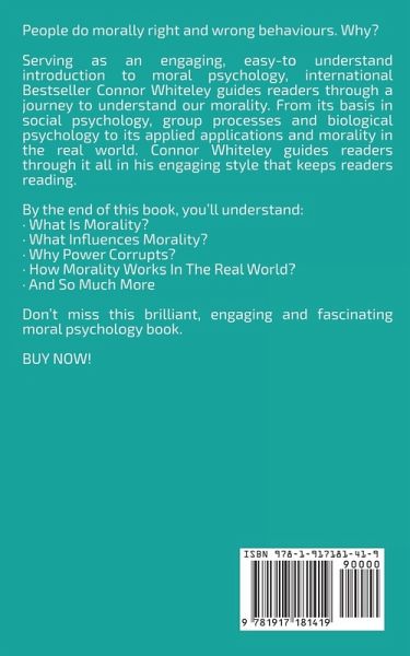People do morally right and wrong behaviours. Why? Serving as an engaging, easy-to-understand introduction to moral psychology, international Bestseller Connor Whiteley guides readers through a journey to understand our morality. From its basis in social psychology, group processes and biological psychology to its applied applications and morality in the real world. Connor Whiteley guides readers through it all in his engaging style that keeps readers reading. By the end of this book, you'll understand: · What Is Morality? · What Influences Morality? · Why Power Corrupts? · How Morality Works In The Real World? · And So Much More Don't miss this brilliant, engaging and fascinating moral psychology book. BUY NOW!Moral Psychology Content Introduction Part One: Introduction To Morality And Moral Psychology Introduction To Moral Reasoning, Moral Judgements And Moral Foundations Theory Principles And Theories Of Morality Introduction To Being Virtuous And Amoral Part Two: Influences On Morality Are Infants Moral? How Does Categorising Our Relationships Impact Our Moral Judgements? How Does Social Influence Impact Morality? Why People Conform? Controversies Of The Experiments How Did Morality Evolve? Why Is Morality Powerful? Part Three: Grey Areas Of Morality Introduction To Moral Grey Areas What Is The Social Anchoring Of Right And Wrong? What Is The Moral Self And How Does It Connect To Moral Grey Areas? The Interplay Between Thoughts And Experiences Why Moral Judgements Aren't Always Bad? How Power Corrupts? Part Four: Real World Morality 5 Signs Of Psychopathic Personality Why Are We Divided On What Makes A Good Society? How Does Lying Evolve Across The Lifespan? Bystanderism And Altruism Why People Don't Help? Altruism Morality And The Basics Of Cult Psychology How Do Narcissists Use Cult Leader Tactics? How Lying Destroys Self-Esteem? Conclusion: Why We Always Need To Be Moral In Psychology And Why There Are No Excuses In This Book