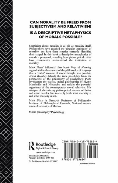 Scepticism about morality is as old as morality itself. Philosophers have attacked the `singular institution' of morality, but have these sceptics correctly identified their target? In this book a descriptive metaphysics of morals is presented, revealing how philosophical critics have consistently misidentified the institution of morality. Mark Platts' influential first book Ways of Meaning argued within the context of the philosophy of language that a `realist' account of moral thought was possible; Moral Realities defends the same possibility from the perspective of the philosophy of psychology. Platts engages the classical moral philosophies of Hume, Mandeville and Nietzsche, and tackles the powerful arguments of the contemporary moral relativists. His critique of the existing philosophical notions of desire and value enables him to clarify both what morality is and what it is not.