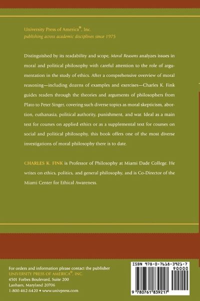 Distinguished by its readability and scope, Moral Reasons analyzes issues in moral and political philosophy with careful attention to the role of argumentation in the study of ethics. After a comprehensive overview of moral reasoning_including dozens of examples and exercises_Charles K. Fink guides readers through the theories and arguments of philosophers from Plato to Peter Singer, covering such diverse topics as moral skepticism, abortion, euthanasia, political authority, punishment and war. Ideal as a main text for courses on applied ethics or as a supplemental text for courses on social and political philosophy, this book offers one of the most diverse investigations of moral philosophy there is to date.