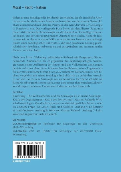 Indem er eine Soziologie der Solidarität entwickelte, die als ernsthafte Alternative zum durkheimschen Programm betrachtet wurde, nimmt Gaston Richard einen besonderen Platz im Pantheon der Gründerväter der Soziologie in Frankreich ein. Das vorliegende Buch bietet ein detailliertes Panorama dieser historischen Rechtssoziologie an, die Richard auf Grundlage eines relationalen, aus der Moral gewonnenen Ansatzes entwickelte. Richards Instrumentarium, das eine starke Nähe zum deutschen Formalismus aufzeigt, diente einer soziologischen Erkenntnis, die eine praktische Lösung gesellschaftlicher Probleme, insbesondere auf europäischen und internationalen Ebenen, zum Ziel hatte.