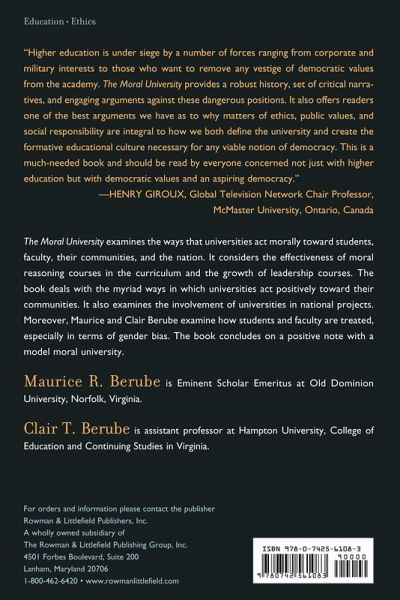 The Moral University examines the ways that universities act morally toward students, faculty, their communities and the nation. It considers the effectiveness of moral reasoning courses in the curriculum and the growth of leadership courses. The book deals with the myriad ways in which universities act positively toward their communities. It also examines the involvement of universities in national projects. Moreover, the Berubes examine how students and faculty are treated, especially in terms of gender bias. The book concludes on a positive note with a model moral university.