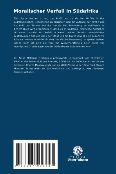 Ziel dieses Buches ist es, das Profil des moralischen Verfalls in der südafrikanischen Gesellschaft zu skizzieren und die Aufgabe der Kirche und die Rolle des Staates bei der moralischen Erneuerung zu definieren. In diesem Buch wird argumentiert, dass es in Südafrika eindeutige Anzeichen für einen moralischen Verfall in einem weiten Bereich menschlicher Bestrebungen gibt und dass der Staat und die Kirche jeweils eine besondere Rolle als treibende Kräfte für eine moralische Erneuerung zu spielen haben. Dieses Buch ist also ein Plan zur Wiederherstellung einer Reihe von moralischen Grundsätzen, die der Südafrikaner übernehmen kann.