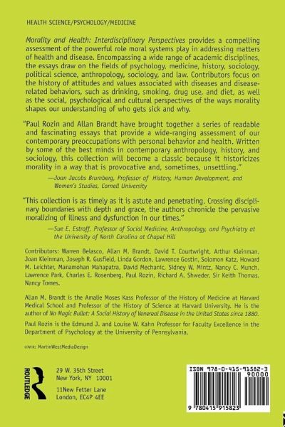 Allan M. Brandt and Paul Rozin PERSPECTIVES ON MORALITY AND HEALTH Keith Thomas - Health and Morality in Early Modern England Charles Rosenberg - Banishing Risk: Continuity and Change in the Moral Management of Disease Allan M. Brandt - Behavior, Disease, and Health in the Twentieth-Century United States: The Moral Valence of Individual Risk David Mechanic - The Social Context of Health and Disease and Choices MORALITY AND CULTURE Arthur Kleinman and Joan Kleinman - Moral Transformations of Health and Suffering in Chinese Society Richard A. Shweder, Nancy C. Much, Manamohan Mahapatra, and Lawrence Park - The Big Three of Morality (Autonomy, Community, Divinity) and the Big Three Explanations of Suffering MORALITY AND BEHAVIOR IN HISTORICAL CONTEXT Sidney Mintz - Sugar and Morality Warren Belasco - Food, Morality, and Social Reform Joseph R. Gusfield - Alcohol in America: The Entangled Frames of Health and Morality David T. Courtwright - Morality, Religion and Drug Use Linda Gordon - Teenage Pregnancy and Out-of-Wedlock Birth: Morals, Moralism, Experts Nancy Tomes - Moralizing the Microbe: The Germ Theory and the Moral Construction of Behavior in the Late Nineteenth-Century Antituberculosis Movement CONTEMOPORARY PERSPECTIVES ON MORALITY AND HEALTH Solomon Katz - Secular Morality Lawrence Gostin - The Legal Regulation of Smoking (and Smokers): Public Health or Secular Morality? Howard M. Leichter - Lifestyle Correctness and the New Secular Morality Paul Rozin - Moralization