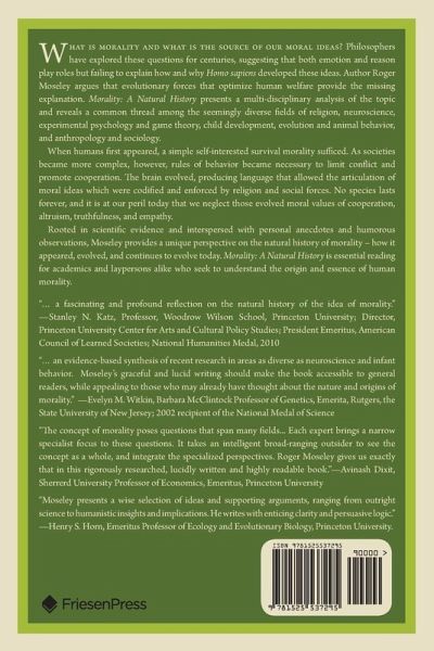 What is morality and what is the source of our moral ideas? Philosophers have explored these questions for centuries, suggesting that both emotion and reason play roles but failing to explain how and why Homo sapiens developed these ideas. Author Roger Moseley argues that evolutionary forces that optimize human welfare provide the missing explanation. Morality: A Natural History presents a multi-disciplinary analysis of the topic and reveals a common thread among the seemingly diverse fields of religion, neuroscience, experimental psychology and game theory, child development, evolution and animal behavior, and anthropology and sociology. When humans first appeared, a simple self-interested survival morality sufficed. As societies became more complex, however, rules of behavior became necessary to limit conflict and promote cooperation. The brain evolved, producing language that allowed the articulation of moral ideas which were codified and enforced by religion and social forces. No species lasts forever, and it is at our peril today that we neglect those evolved moral values of cooperation, altruism, truthfulness, and empathy. Rooted in scientific evidence and interspersed with personal anecdotes and humorous observations, Moseley provides a unique perspective on the natural history of morality - how it appeared, evolved, and continues to evolve today. Morality: A Natural History is essential reading for academics and laypersons alike who seek to understand the origin and essence of human morality.