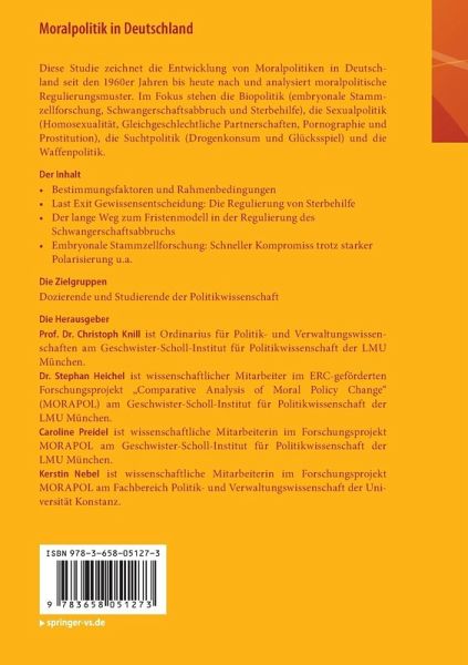 Diese Studie zeichnet die Entwicklung von Moralpolitiken in Deutschland seit den 1960er Jahren bis heute nach und analysiert moralpolitische Regulierungsmuster. Im Fokus stehen die Biopolitik (embryonale Stammzellforschung, Schwangerschaftsabbruch und Sterbehilfe), die Sexualpolitik (Homosexualität, Gleichgeschlechtliche Partnerschaften, Pornographie und Prostitution), die Suchtpolitik (Drogenkonsum und Glücksspiel) und die Waffenpolitik.